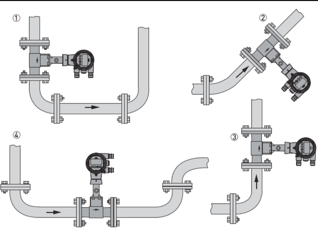 For gas/steam applications, the pipeline is always full of gas. Therefore, the flowmeter can be installed in vertical upward flow, vertical downward flow, or horizontal orientations. However, it must not be installed at low points. The recommended installation positions are: