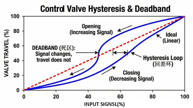 When you reverse the direction of the input signal (e.g., switching from opening to closing), the valve must travel a section of null stroke before the valve plug actually starts to move in the opposite direction. This section of null stroke is what we call the deadband.