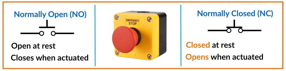 A push button can have two basic contact types: Normally Closed and Normally Open.