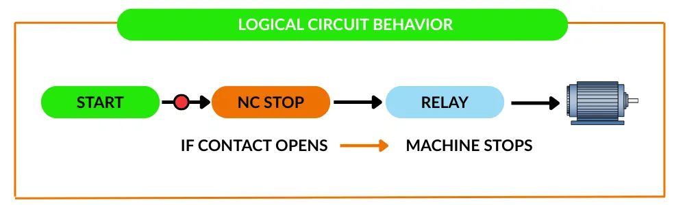 NC contacts naturally satisfy all these requirements. That is why emergency stop devices, safety door switches, and interlocks almost always use NC logic.